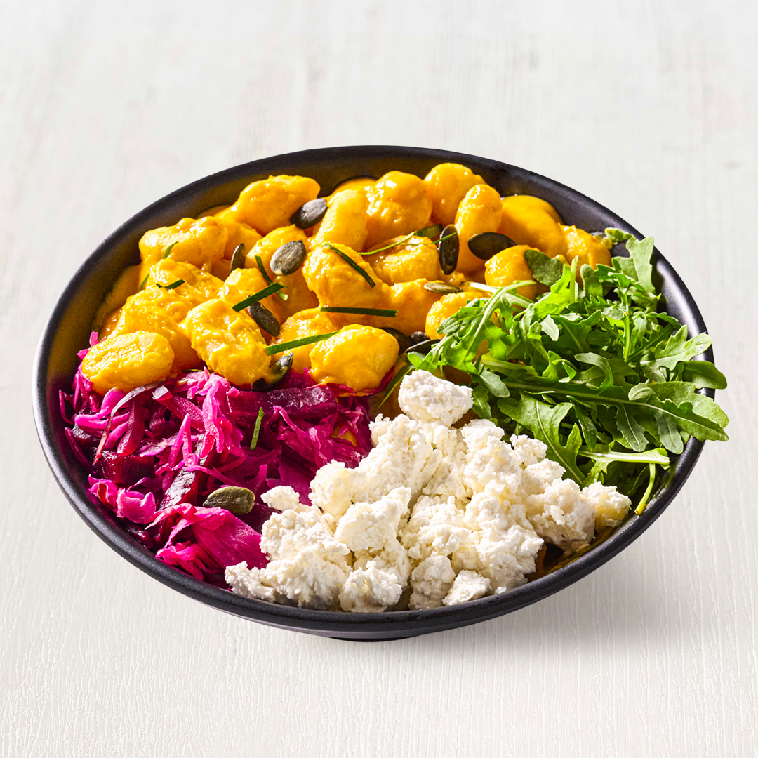 Složení: bramborové noky, dýňové kari s limetovými listy, červené zelí s řepou, kozí sýr, rukola, dýňová semínka, bylinkový olej