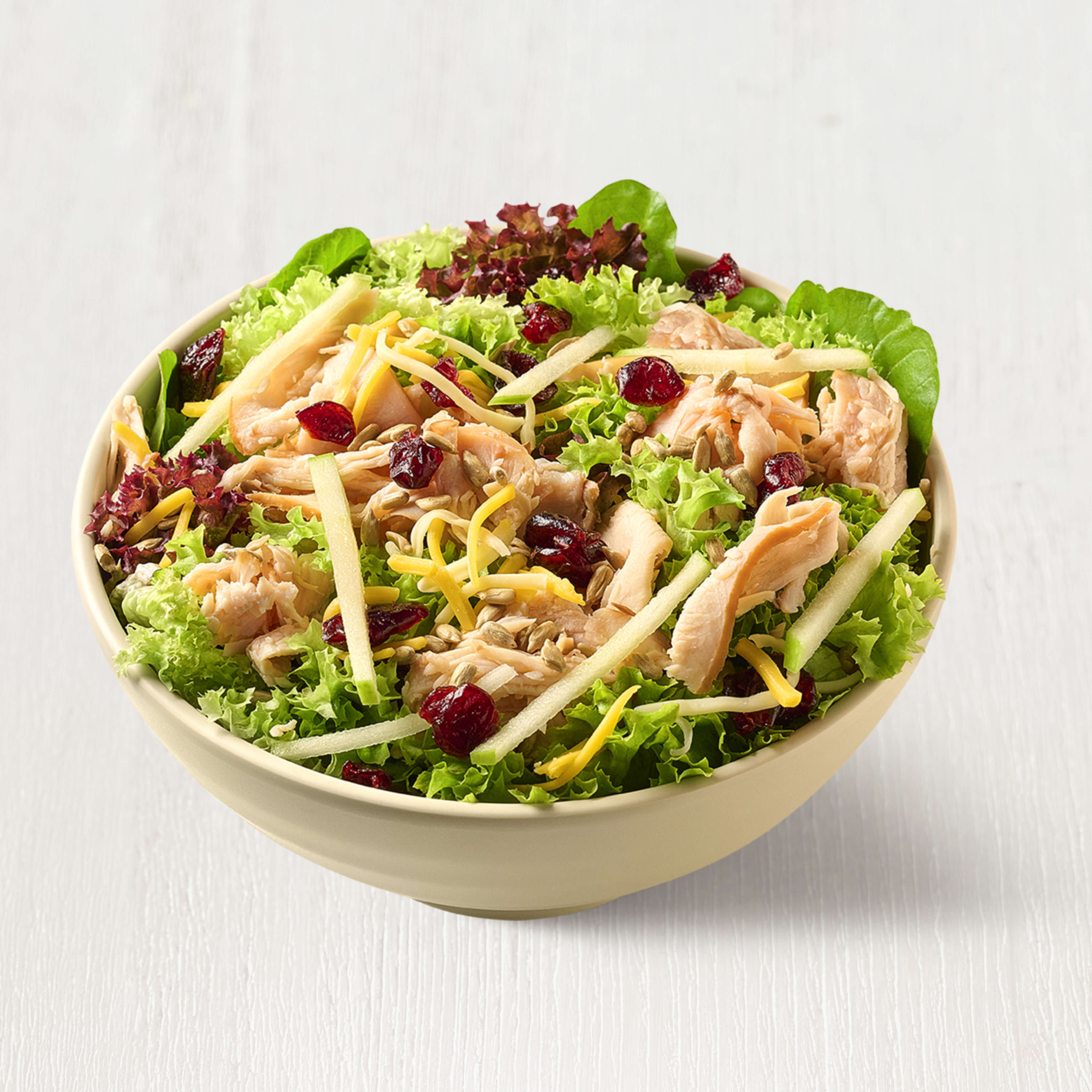 Složení: směs listových salátů, uzená kuřecí prsa, strouhaný sýr (gouda, cheddar), jablko Granny Smith, medovo-hořčičná zálivka, slunečnicová semínka, sušená klikva