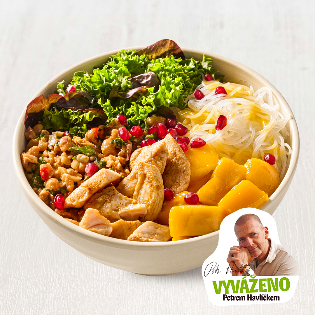 Složení: skleněné nudle vermicelli, mango, grilovaná kuřecí prsa, arašídová salsa, mango-chilli zálivka, směs listových salátů, granátové jablko