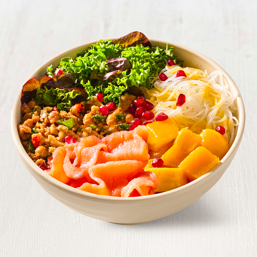Složení: skleněné nudle vermicelli, mango, arašídová salsa, uzený losos, mango-chilli zálivka, směs listových salátů, granátové jablko
